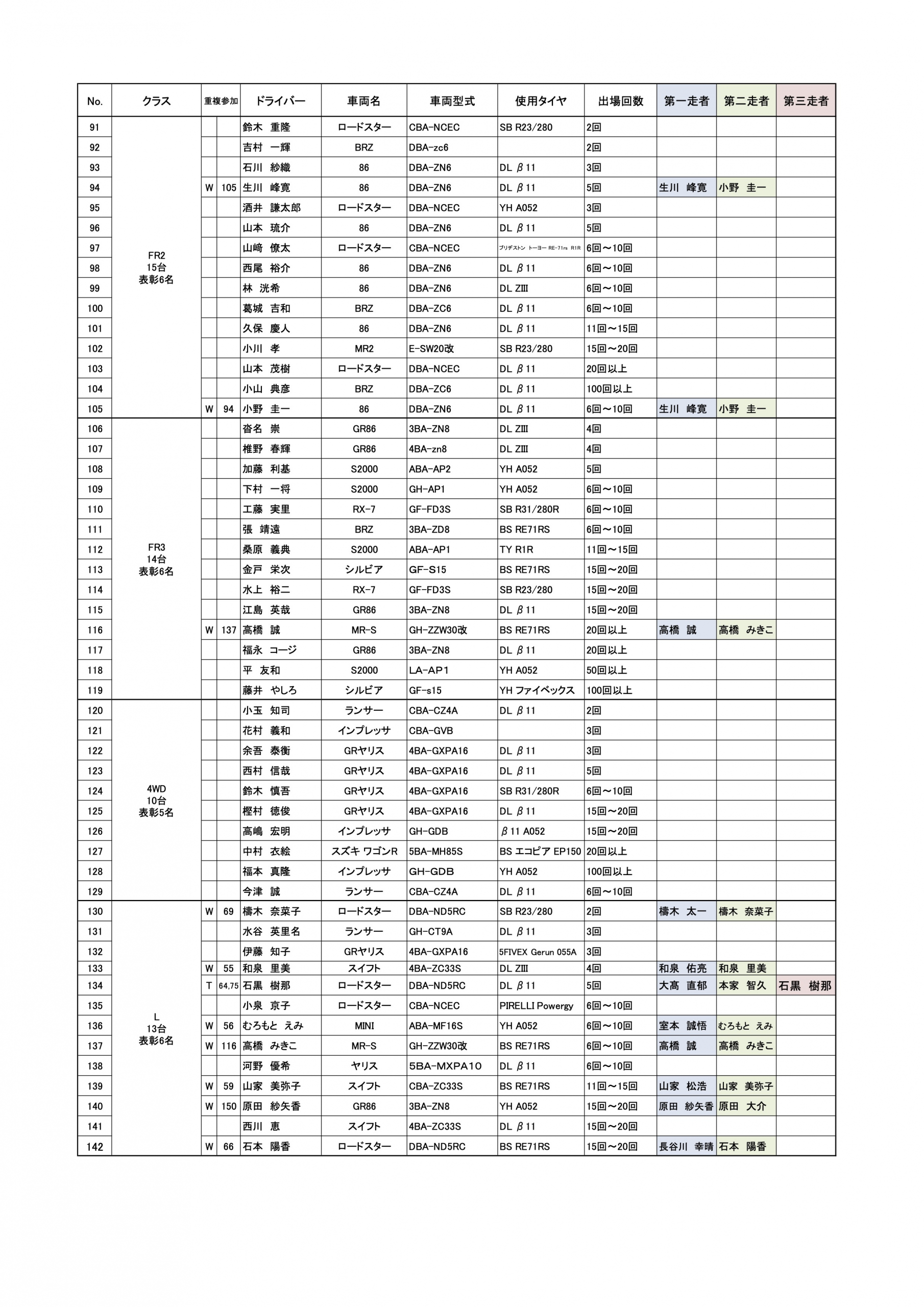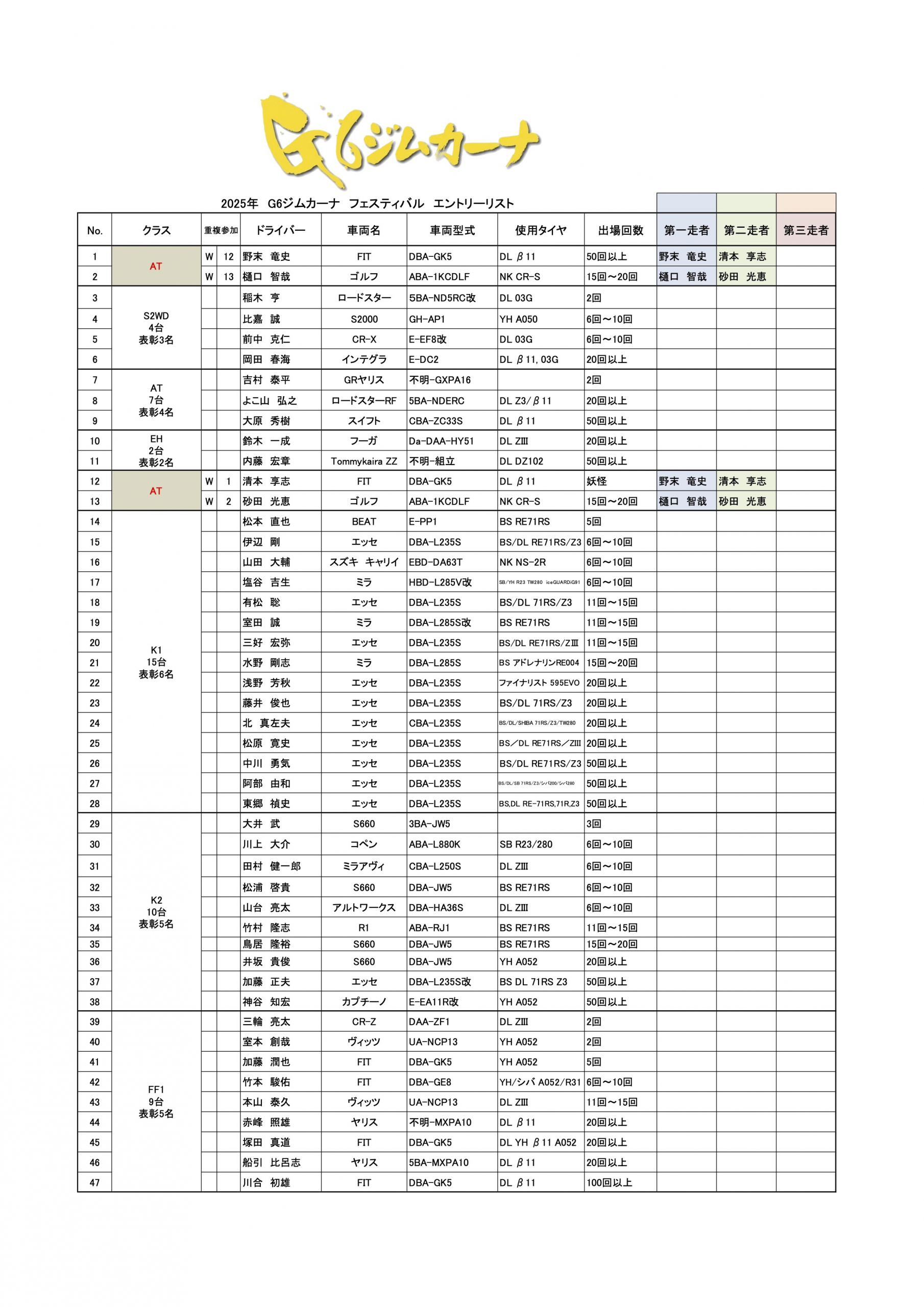 G6ジムカーナフェスティバル 正式エントリーリスト
